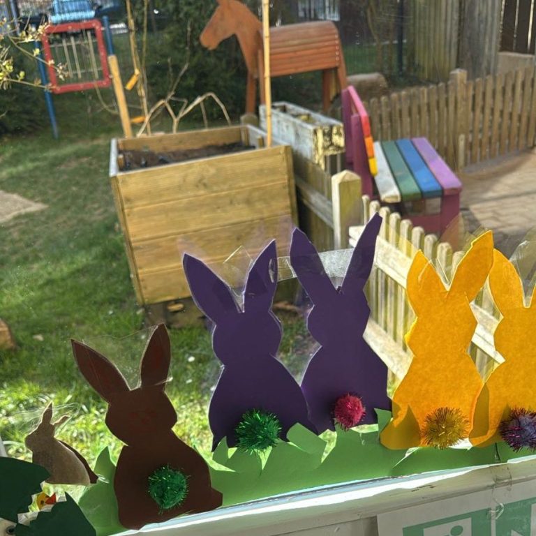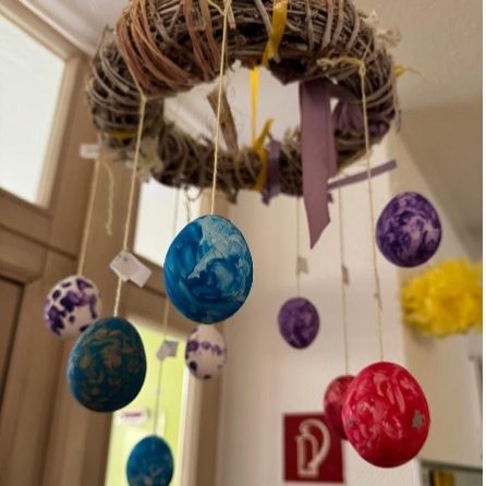 Pünktlich zum Frühlingsanfang haben sich bei uns viele bunte Hasen auf das Fenster gesetzt und schauen sich in unserem Garten genau um. Ganz links auf dem Foto befindet sich auch noch ein kleines Küken, das gerade dabei ist, aus seinem Ei auszubrechen. Die scheinen auch genau da bleiben zu wollen, zumindest bis Ostern. In den anderen Räumen haben sich auch welche niedergelassen. Zum Glück haben wir ja genug Platz. Für Ostern ist der Kindergarten am Bombach demnach auf jeden Fall gerüstet.