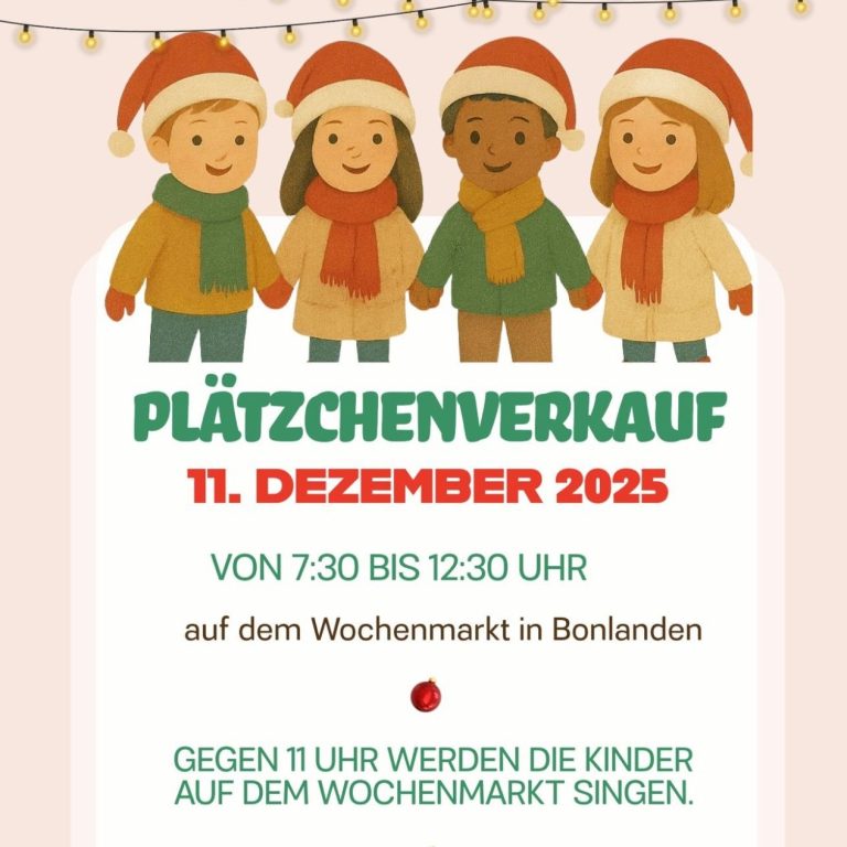 Am Donnerstag, 11. Dezember 2025, gibt es auf dem Wochenmarkt in Bonlanden von 7:30 bis 12:30 Uhr selbstgebackene Plätzchen. Der Erlös ist für neue Bücher im Kindergarten bestimmt. Gegen 11 Uhr singen die Kinder. Wir freuen uns über Ihren Besuch!