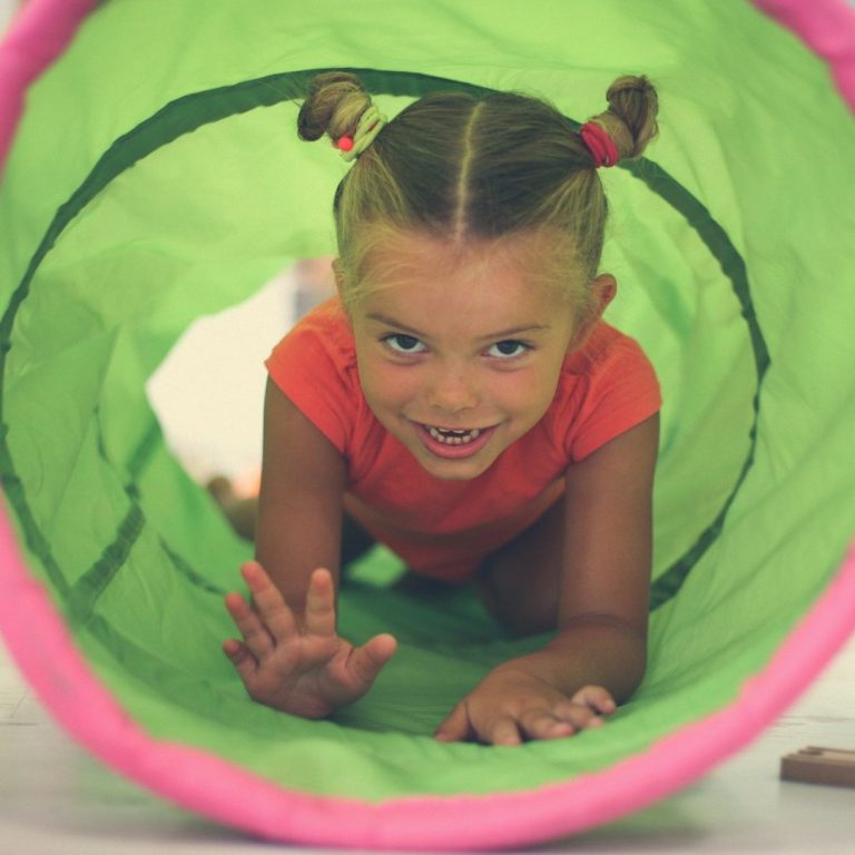 Kind darf durch den Tunnel kriechen wie durch einen Kokon, um auf der anderen Seite gewachsen, bzw.